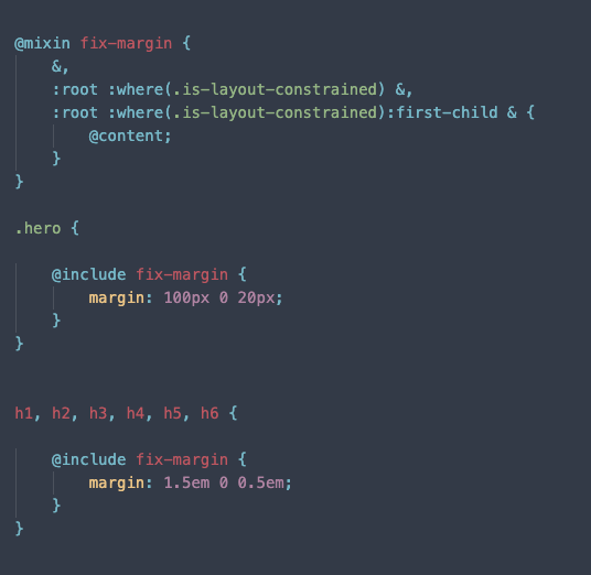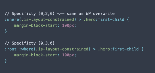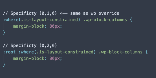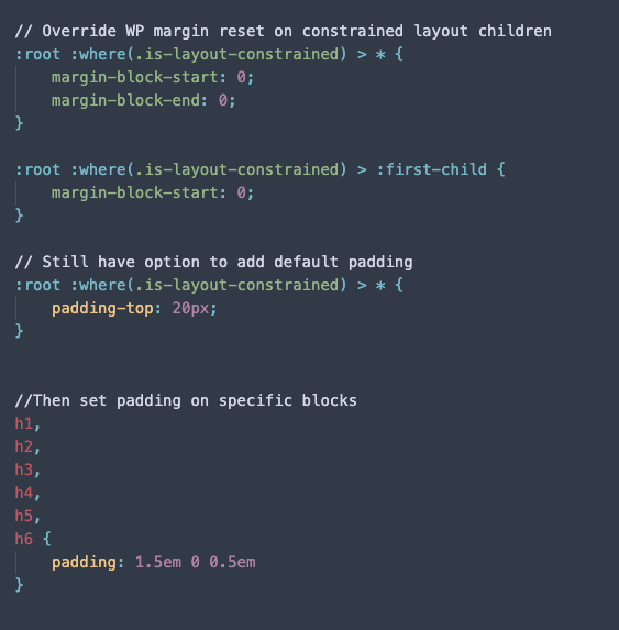 Categories: Development, WordPress Posted: February 5, 2026February 6, 2026 by Carlos Prieto The Problem The layout issue ultimately comes down to constraint styles coming from the Group block itself. I didn’t realize this at first because our theme suppresses the Group block. So when I inspected the WordPress 2024/2025 default themes, I noticed they have these classes wrapping the content in the PHP templates (content.php, content-page.php, etc.). Once I copied that approach, everything worked as expected. …or did it? Since we’re essentially wrapping all our content in the Group Block it comes with some undesirable styling. Overrides top margin to 24px on all direct children, and bottom margin to 0. It removes the top margin from the first-child The issues this causes are obvious. But the frustrating part is how the selector is set up. When it selects it through the is-layout-constrained it adds a higher specificity (0,1,0) than any of our base elements (0,0,1). The :first-child is even worse, that has a specificity of (0,2,0). Possible Solutions Option 1 We can set a default margin, like 20px for example. That will get applied to all the immediate children. Then we would have to specify margins for all our blocks that would match whether they’re inside the constrained-layout or not. Pros: Keep our ability to use margins If we use a @mixin, doesn’t add much more code Cons: Have to remember to add the specificity or use the @mixin on every stylesheet May fall into a specificity war We can streamline this by making a @mixin that wraps our styles in the specific selectors that encompasses all the options. Then we would just use that where ever it’s required. Option 2 We zero out margins entirely and rely on padding for vertical spacing. Pros: Avoids cascading specificity issues all together since it only affects margins Easier mental map (removing margins as spacing option) Cons: Depends heavily on how blocks are wrapped and structured (may have to refactor some blocks) Blocks like Columns and Heroes rely heavily on margins for vertical spacing Columns with backgrounds are especially problematic Worst of all (in my opinion), we’re eliminating margins for spacing* *Affects only immediate children in the layout but then we would have two separate rules for inside and out which sorta defeats the simplicity of the mental map Parting Thoughts I think we need to address this ASAP as it’s going to be an issue on every site going forward. Both options have the common benefit of setting a baseline spacing to all our elements, but will require refactoring code to different degrees. Ultimately, I believe option 1 with a @mixin is the better option. I think removing margins as a spacing tool is a mistake, and would require more work. Post navigation Previous: Our WordPress boilerplateNext: The power of theme.json
