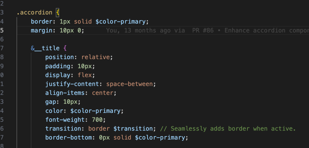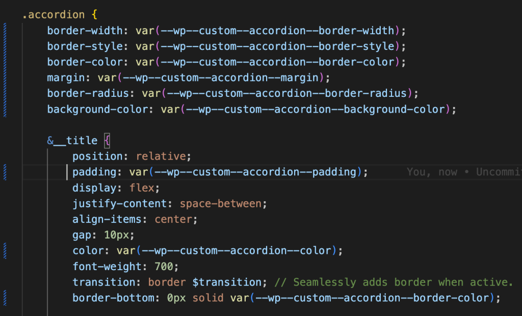 Normally, when styling a custom block like an accordion, our stylesheet use Sass variables. We now have many of our basic Sass variables linked to WordPress presets from the theme.json.